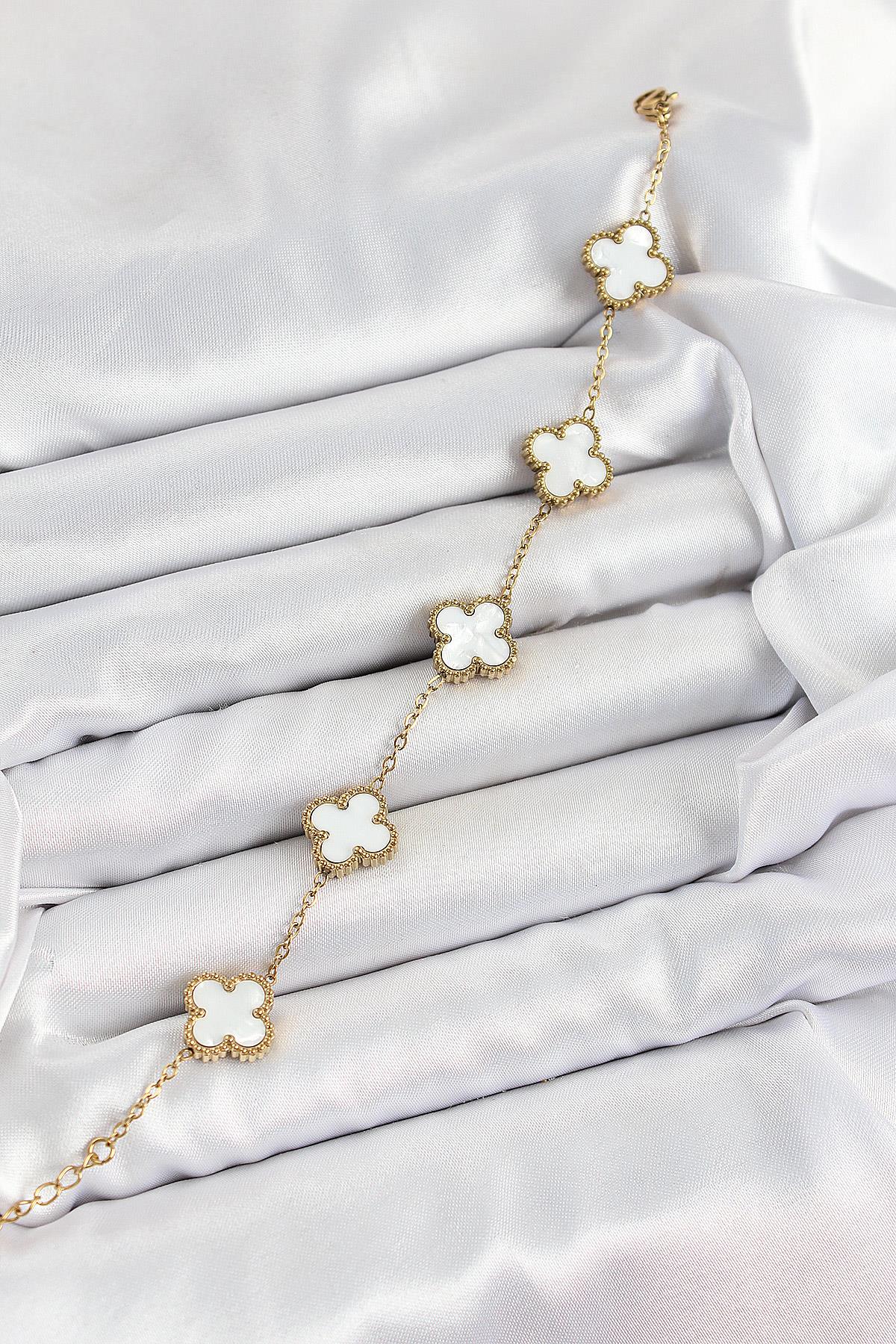 316L Çelik Beyaz Sedef Yonca Model Gold Renk Kadın Bileklik