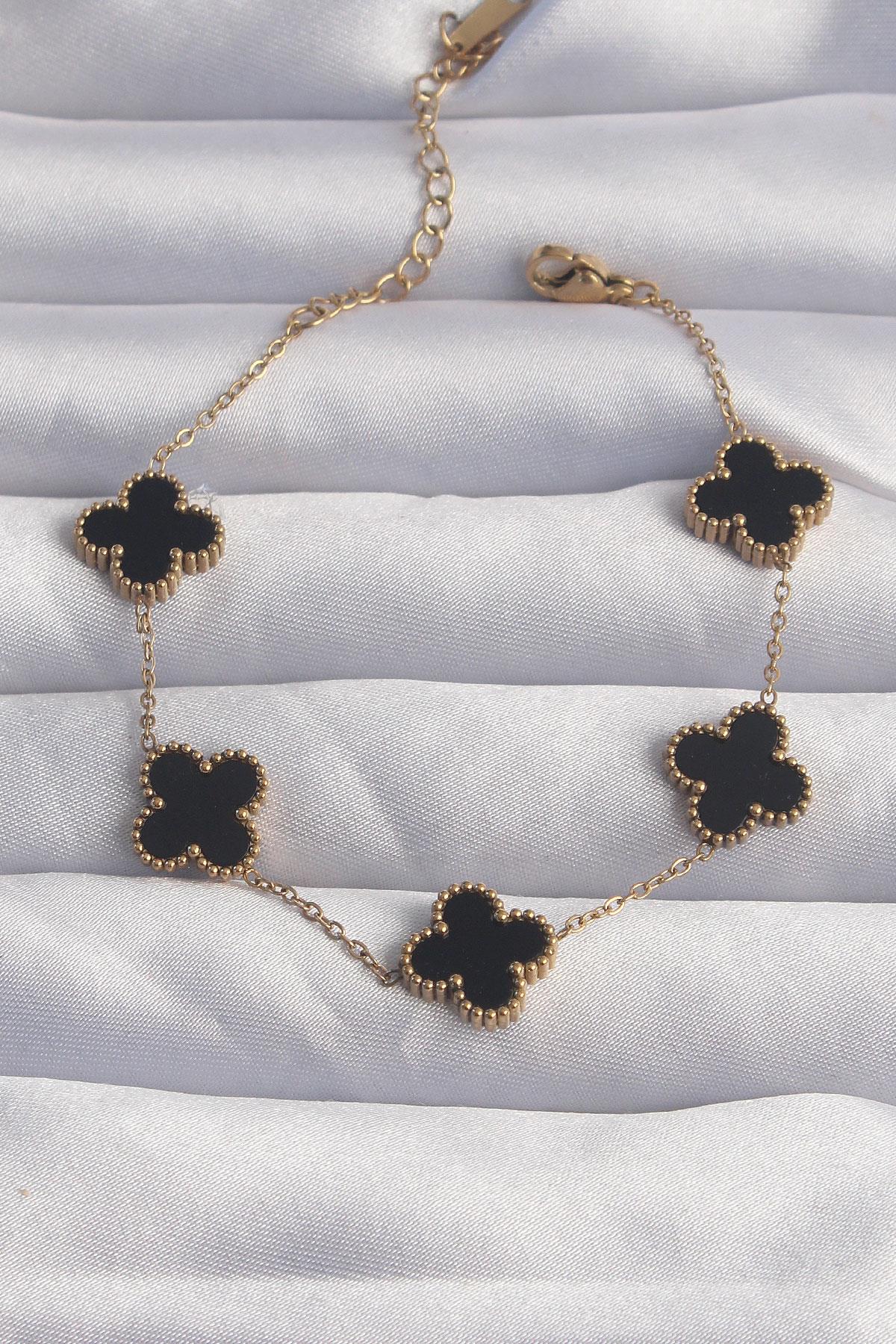 316L Çelik Gold Renk Siyah Mineli Yonca Bileklik