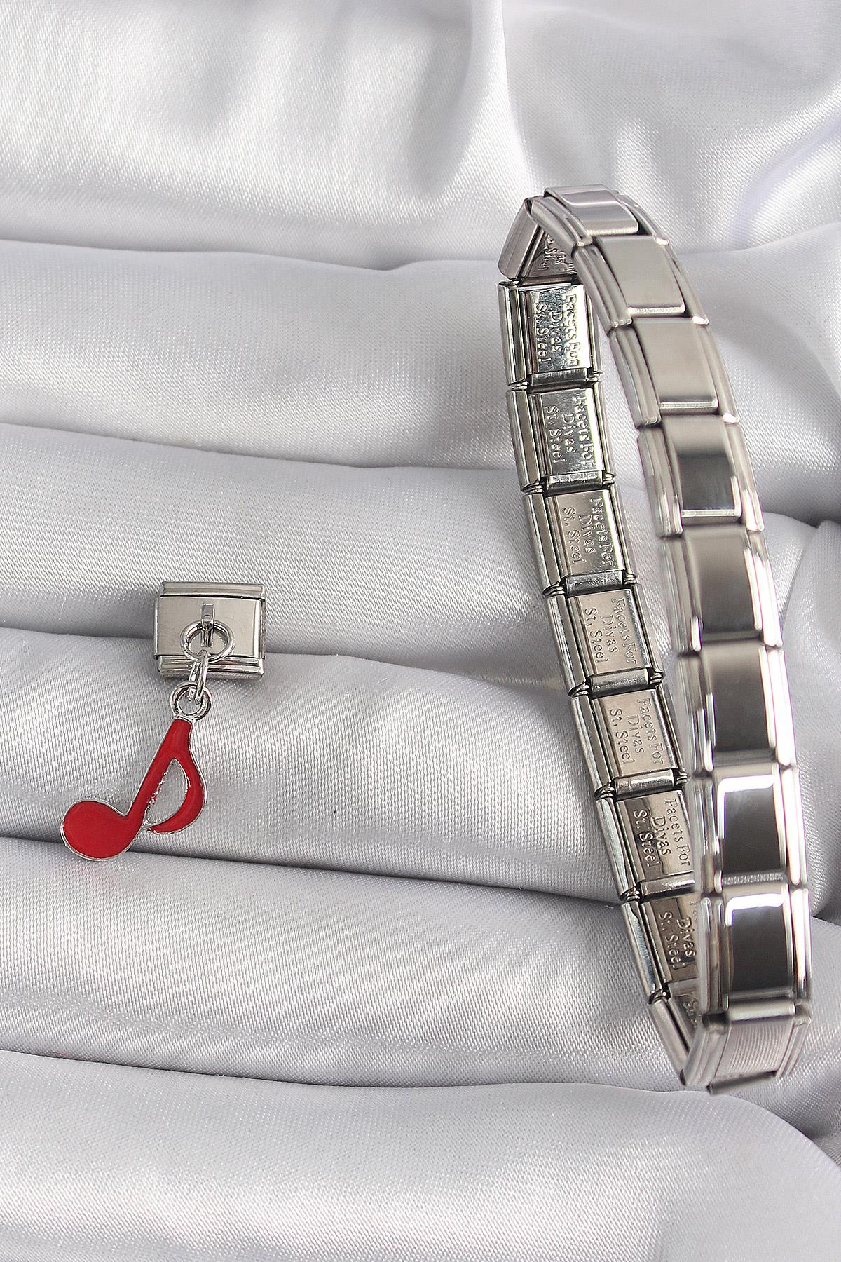 316L Çelik Gümüş Renk Kırmızı Nota Model Nomination Charm