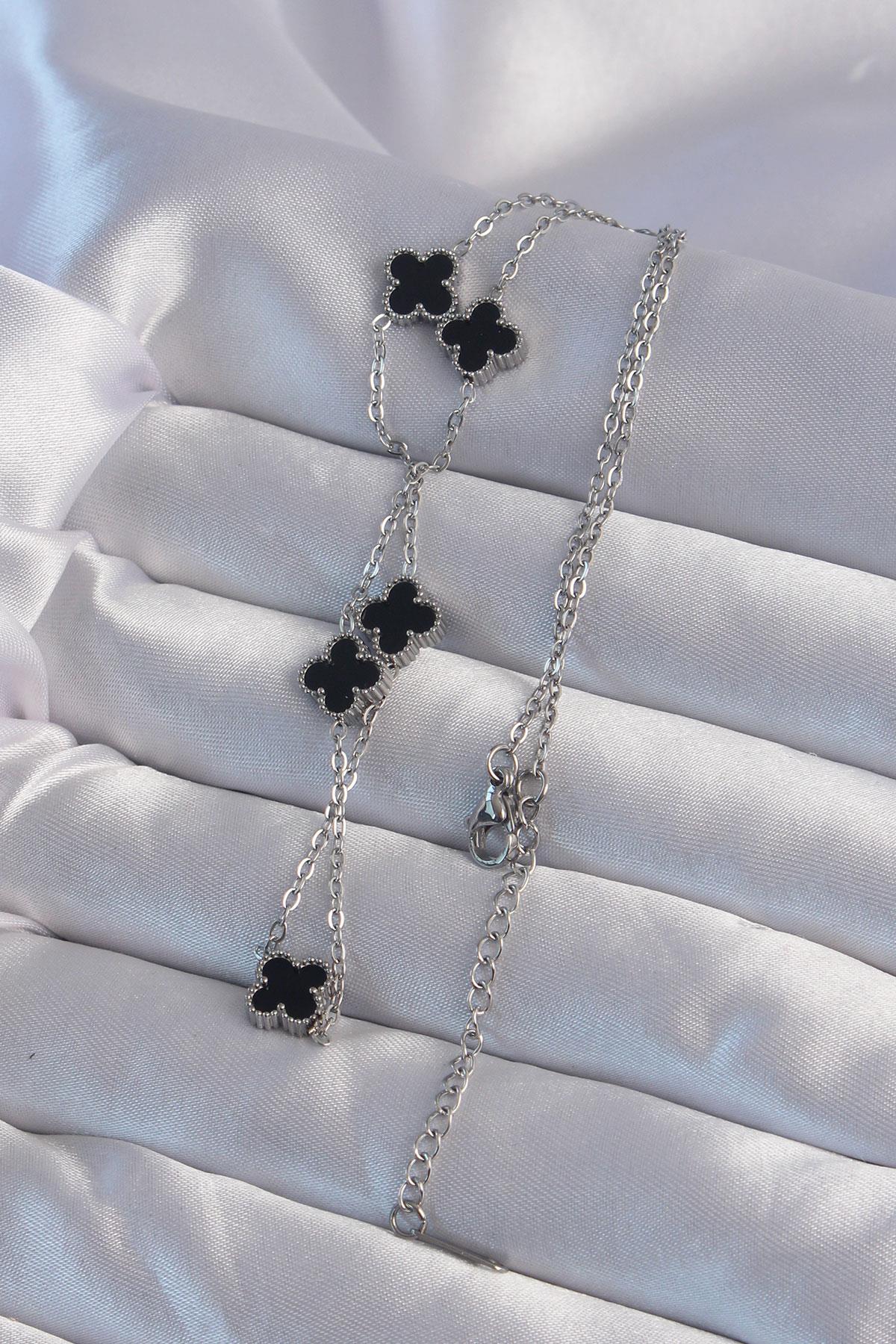 316L Çelik Gümüş Renk Minimal Siyah Mineli Yonca Kolye
