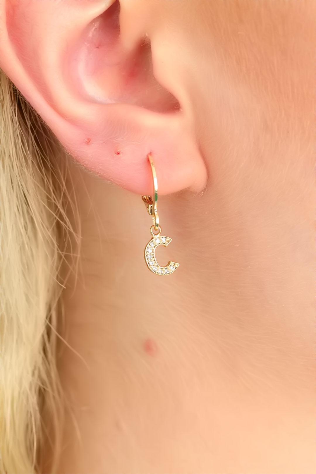 Gold Renk Zirkon Taşlı C Harf Bayan Küpe
