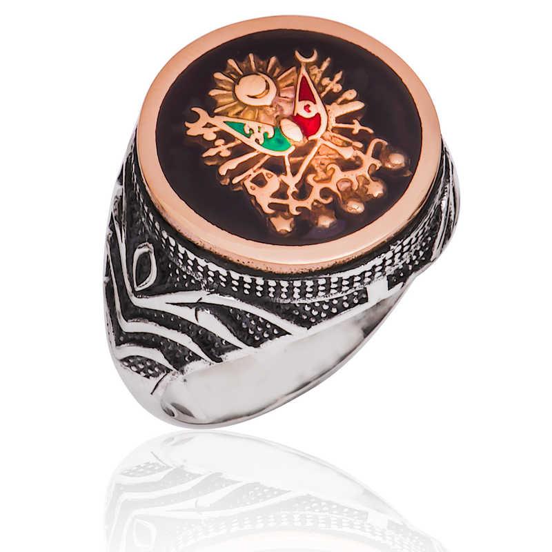 Osmanlı İmparatorluğu Devlet Arması, 19. yüzyılda Avrupa Birleşik Krallık devlet geleneğindeki nişanlardan etkilenilerek Osmanlı Devleti için hazırlanmıştır. Ondan önce, padişahların tuğraları devlet nişanı yerine geçiyordu. Osmanlı nişanının son hali, 17 Nisan 1882\"de Sultan II. Abdülhamit tarafından yürürlüğe konmuştur. Osmanlı Devlet Nişanı\"nın içinde iki tane bayrak vardır. Kırmızı zeminde ay-yıldız bulunan bayrak Osmanlı Hanedanı\"nı, yeşil zemindeki bayrak İslam halifeliğini simgelemektedir. Terazi, Osmanlı adaletini, terazide bulunan kitaplar da adaletin kaynağı olan Osmanlı kanunnamelerini ve Kur\"an-ı Kerim\"i temsil etmektedir. Siz de Osmanlı temalı, gümüş erkek yüzüğü severek kullanabilir, sevdiklerinize hediye edebilirsiniz. Yüzük 925 ayar gümüşten imal edilmiştir. Gümüş üzerine oksit kaplama yapılmıştır. Üzeri şeffaf mine kaplamadır. Ürünlerimizin tamamı el emeği ile üretilmiştir. Gümüş ve değerli taşlar nedeniyle ürün ağırlığında ± %10 sapma olabilmektedir.