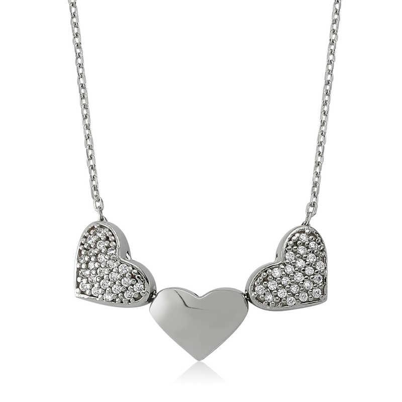 Kalp deseniyle aşkı ifade eden gümüş üç kalpli bayan kolye ile sevginiz, sevdiğiniz kadının teninde hayat bulsun. Genç sevgililerin özel günlerde seçebileceği üç kalpli bayan kolye modeli ile sevdiğinizin boynunu aşkla süsleyin. Sizin olduğu kadar sevdiklerinizin de keyifle takacağı bu kolye en güzel hediyelerden biri olacaktır. Üç kalpli bayan kolye 925 ayar gümüşten imal edilmiştir. Gümüş üzerine rodyum kaplama yapılmıştır. Rodyum kaplama yapılan gümüş bayan kolye modelleri parlaklığını uzun süre muhafaza eder ve oksitlenmesi gecikir. Kolye üzerinde bulunan taşlar zirkondur. Gümüş olan zincir boyu ortalama 45 cm"dir. Tüm bayan kolye modellerinde olduğu gibi gümüş üç kalpli bayan kolye modeli de el emeği ile üretilmiştir. Gümüş ve değerli taşlar nedeniyle belirtilen ürün ağırlığında ± %10 sapma olabilmektedir.