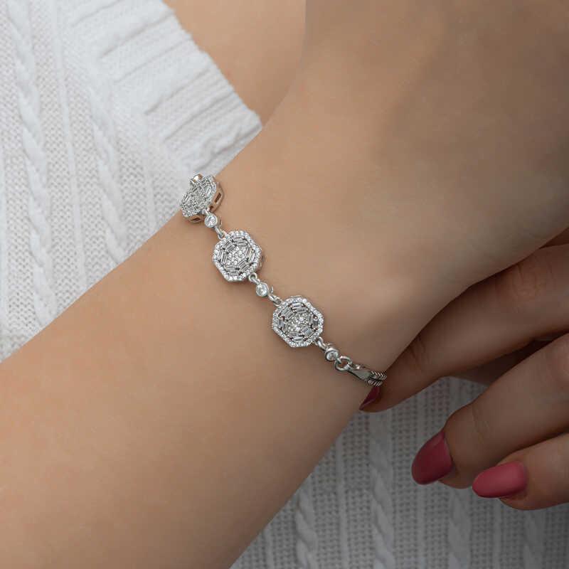 Modaya uyumlu şekilde tasarlanan gümüş baget bileklik modellerini hem gündelik yaşantınızda hem özel gün ve gecelerinizde şık bir şekilde kullanabilirsiniz. Yenilikçi her yaştan kadının beğenisine hitap eden ürünlerle kombinlerinizi tamamlayabilirsiniz. Her biri farklı bir stile hitap edebilen tasarımlarla sizler de spor, klasik ve alternatif giyim tarzlarınıza uygun modellerimizi tercih edebilirsiniz. Bu şık bileklik; doğum günü hediyesi, sevgililer günü hediyesi veya özel günlerde tercih edilebilecek mükemmel bir seçenektir. Gümüş baget taşlı kadın bileklik 925 ayar gümüşten imal edilmiştir. Bu bileklik üzerine rodyum kaplama yapılmıştır. Rodyum kaplama yapılan ürünler parlaklığını uzun süre muhafaza eder, oksitlenmesini geciktirir. Tüm gümüş kadın bileklik modellerinde olduğu gibi gümüş baget taşlı kadın bileklik modeli de el emeği ile üretilmiştir. Gümüş ve değerli taşlar nedeniyle belirtilen ortalama ürün ağırlığında ± %10 sapma olabilmektedir.