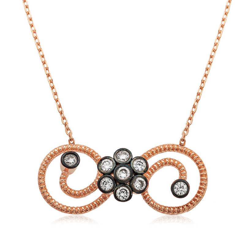 Sevgilinize sonsuz aşkı ifade etmenin en güzel, en anlamlı yollarından biri de sonsuzluk sembolü olan aksesuarlardır. Bu aksesuarlar içersinde de en dikkat çekici olanı ise kolyelerdir. Sevgilinize hediye edeceğiniz bu sonsuzluk kolye ile ona olan aşkınızı, sevginizi ifade edebilir, sonsuza kadar birlikte olacağınız mesajını verebilirsiniz. Bu çiçekli sonsuzluk bayan kolye 925 ayar gümüşten imal edilmiştir. Gümüş üzerine rose altın kaplama yapılmıştır. Rose altın kaplama yapılan gümüş bayan kolye modelleri parlaklığını uzun süre muhafaza eder. Kolye üzerinde bulunan beyaz taşlar zirkondur. Tüm bayan kolye modellerinde olduğu gibi gümüş çiçekli sonsuzluk bayan kolye modeli de el emeği ile üretilmiştir. Gümüş ve değerli taşlar nedeniyle ürün ağırlığında ± %10 sapma olabilmektedir.