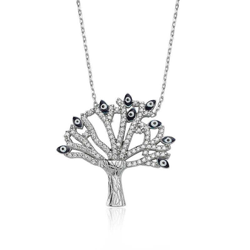 Ağaç sembolü her kültürde yenilenmenin gücünü temsil etmiştir ve saygı görmüştür. Kökleri yerdeyken, göklere yükselen dalları ile cennetle yeryüzünü birleştiren bir köprü olmuştur. Dilek ağacı yeni bir yaşamın büyümesini ve yeni fırsatları sembolize eder. Siz de sevdiklerinize ve değer verdiğiniz kişilere bu dilek ağacı motifli kolyeyi hediye edebilir böylelikle onlara vermiş olduğunuz değeri gösterebilirsiniz. Gümüş dilek ağacı bayan kolye 925 ayar gümüşten imal edilmiştir. Gümüş üzerine rodyum kaplama yapılmıştır. Rodyum kaplama yapılan gümüş bayan kolye modelleri parlaklığını uzun süre muhafaza eder ve oksitlenmesi gecikir. Kolye üzerinde bulunan taşlar zirkondur. Gümüş olan zincir boyu ortalama 45 cm"dir. Tüm gümüş bayan kolye modellerinde olduğu gibi gümüş dilek ağacı bayan kolye modeli de el emeği ile üretilmiştir. Gümüş ve değerli taşlar nedeniyle belirtilen ortalama ürün ağırlığında ± %10 sapma olabilmektedir.