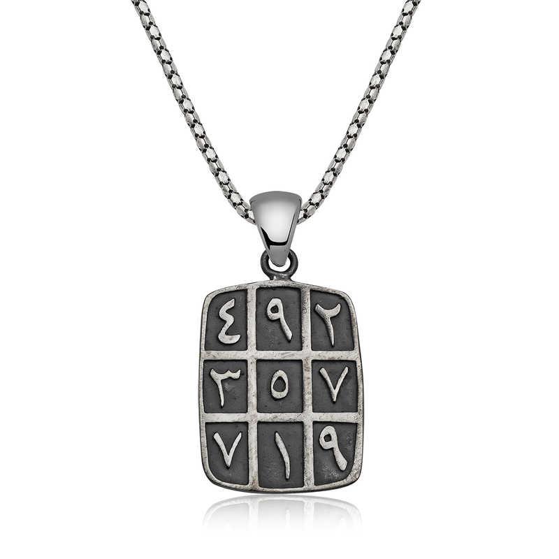 Ebced, geleneksel Arap alfabesinin eski sıralanışından (elif, ba, cim, dal) ilk dört harfinin okunuşlarıyla (E-B-Ce-D) türetilmiş bir sözcüktür. Ebced hesabı ise Ebced rakamları denilen alfabetik bir sayı sistemini kullanarak, kelime, cümlecik veya cümlelerin sayısal değerini hesaplama ve bunlardan anlamlar çıkartma işlemidir. Teori incelenen kelime, cümlecik veya metinde bir şekilde gizli şifreleme bulunduğu varsayımına dayanır. 925 ayar gümüşten imal edilmiştir. Gümüş üzerine oksit kaplama yapılmıştır. Oksit kaplama yapılan gümüş kolye modelleri parlaklığını uzun süre muhafaza eder ve oksitlenmesi gecikir. Gümüş olan zincir boyu ortalama 55 cm\"dir. Bu ebced kolye modeli diğer gümüş kolye modellerinde olduğu gibi el emeği ile üretilmiştir. Gümüş ve değerli taşlar nedeniyle belirtilen ortalama ürün ağırlığında ± %10 sapma olabilmektedir.