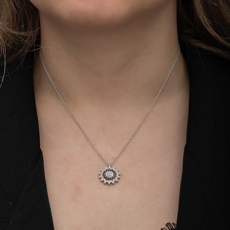 Güneş; ışığın, bilginin, iyiliğin, gücün ve yönetimin sembolüdür. Bu ışıl ışıl ve farklı tasarımıyla göz kamaştıran kolye; 925 ayar gümüşten imal edilmiştir. Gümüş üzerine rodyum kaplama yapılmıştır. Rodyum kaplama yapılan gümüş ürünler parlaklığını uzun süre muhafaza eder, oksitlenmesi gecikir. Gümüş beyaz taşlı güneş kadın kolye üzerinde bulunan taşlar zirkon"dur. Tüm gümüş kolyelerde olduğu gibi gümüş güneş kadın kolye de tamamı el emeği ile üretilmiştir. Gümüş ve değerli taşlar nedeniyle belirtilen ortalama ürün ağırlığında ± %10 sapma olabilmektedir.