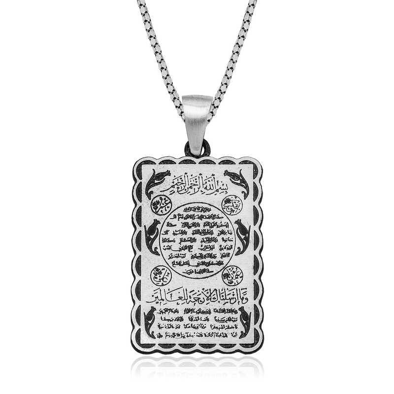 Hilye, Osmanlı hattatlarca 17. yüzyılda geliştirilen bir süsleme sanatıdır. Kelime anlamı olarak süs, ziynet, güzellik gibi anlamlara gelen hilye bunların yanında suret, sıfat, hilkat gibi anlamlar da taşımaktadır. Toplamda sekiz bölümün bulunduğu hilye dört ana bölümden oluşur. Bunlar "başmakam", "göbek", "kuşak" ve "etek"tir. Diğer dört bölüm ise ana bölümleri tamamlayıcı olarak işlev görürler. Başmakam; Hilyenin en üst kısmında yer alan bu bölümde besmele yer alır. Kuşak; bu bölümde Muhammed ile ilgili kısa bir ayet bulunur. Bu ayet genellikle Enbiya Suresi"nin 107. ayeti yani "biz alemlere ancak rahmet olarak gönderdik" kısmı bulunur. Ancak bazı hilyelerde bu kısma "ey habibim sen olmasaydın kâinatı yaratmazdım" manasına gelen "levlâke levlâk lema halakatu"l-eflâk" hadisi de yazılırdı. Göbek; hilye metninin en uzun bölümünün yerleştirildiği bu bölüm yuvarlak veya ovaldir. Muhammed ile ilgili anlatımların yer aldığı bölümdür. Etek; göbek kısmına sığmayan hilye metninin devamı bu bölüme yazılır. Metnin son satırında ise hilye yazarının adı ve hilyenin yazılış tarihi yer alır. Diğer bölümler; ana bölümlerin dışında kalan bu dört bölüm göbeğin etrafında yer alan dört daire şeklindedir. Çoğunlukla dört halifenin yazıldığı bu dört bölümde kimi zaman Muhammed"in dört ismi yer alır. Siz de manevi anlamı olan bu kolyeyi severek kullanabilir sevdiklerinize hediye edebilirsiniz. Kolye 925 ayar gümüşten üretilmiştir. Gümüş üzerine oksit kaplama yapılmıştır. Oksit kaplama yapılan kolye modelleri otantik bir görünüme sahip olur. Tüm kolyelerde olduğu gibi gümüş Hilye-i Şerif kolye de el emeği ile üretilmiştir. Gümüş ve değerli taşlar nedeniyle ürün ağırlığında ± %10 sapma olabilmektedir.
