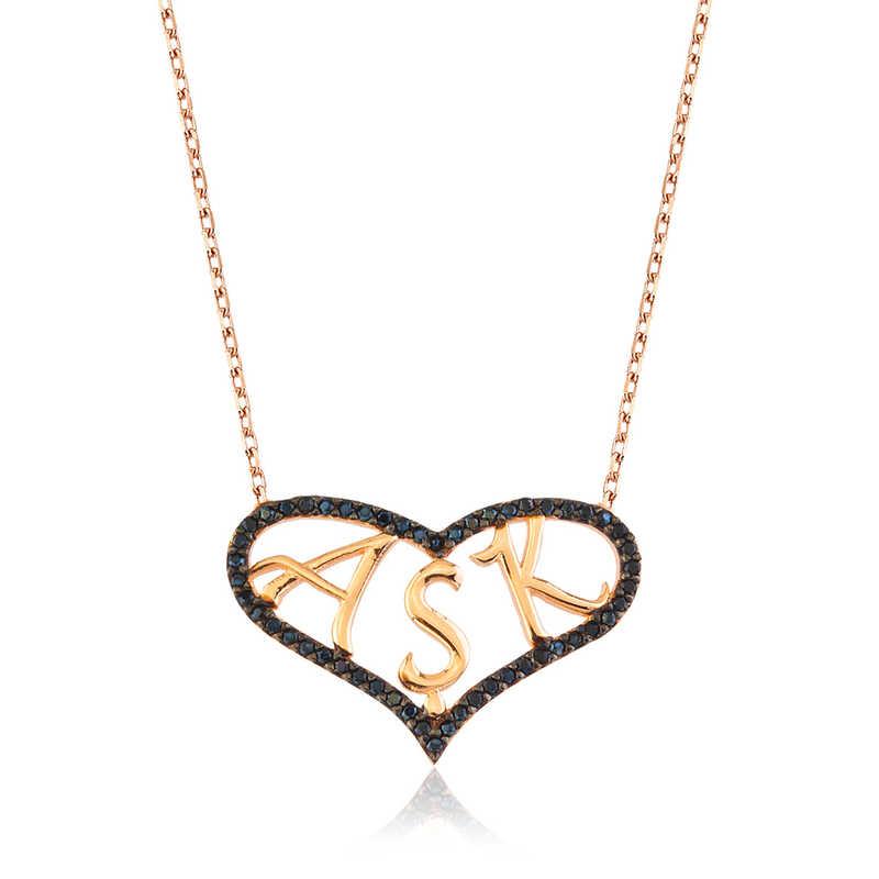 Kalp deseniyle aşkı ifade eden bu kolye ile sevginiz, sevdiğiniz kadının teninde hayat bulsun. Genç sevgililerin ve kendini genç hissedenlerin özel günlerde seçebileceği bu kalpli bayan kolye ile sevdiğinizin boynunu aşkla süsleyin. Sizin olduğu kadar sevdiklerinizin de keyifle takacağı kalpli kolye sevdiğinize en güzel hediyelerden biri olacaktır. Kalpli aşk bayan kolye 925 ayar gümüşten imal edilmiştir. Gümüş üzerine rose kaplama yapılmıştır. Rose kaplama yapılan gümüş bayan kalpli aşk kolyeler parlaklığını uzun süre muhafaza eder ve oksitlenmesi gecikir. Kolye üzerinde bulunan siyah taşlar zirkondur. Gümüş olan zincir boyu ortalama 45 cm'dir. Tüm bayan kolyelerde olduğu gibi gümüş kalpli aşk bayan kolye de el emeği ile üretilmiştir. Gümüş ve değerli taşlar nedeniyle belirtilen ortalama ürün ağırlığında ± %10 sapma olabilmektedir.