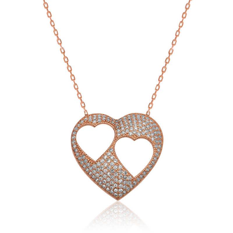 Zirkon taşlarla süslenmiş bayan kalp kolye modeli 925 ayar gümüşten imal edilmiştir. Gümüş kolye üzerine rose altın kaplama yapılmıştır. Rose altın kaplama yapılan gümüş bayan kalpli kolye modelleri parlaklığını uzun süre muhafaza eder ve oksitlenmesi gecikir. Bu özel kolye tasarımı sevdiklerinize sevildiğini gösterecek anlamlı ve ışıl ışıl bir hediye olacaktır. Bu özel tasarım kolye modeli üzerindeki taşlar zirkondur. Gümüş kalpli bayan kolye ile gelecek zincir boyu ortalama 45 cm"dir. Gümüş bayan kolye modellerinin tamamı el emeği ile üretilmiştir. Gümüş ve değerli taşlar nedeniyle belirtilen ortalama ürün ağırlığında ± %10 sapma olabilmektedir.
