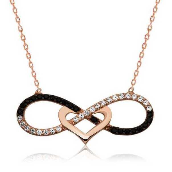 Sevgilinize sonsuz aşkı ifade etmenin en güzel, en anlamlı yollarından biri de ona sonsuzluk temalı gümüş takılar hediye etmektir. Sevgilinize hediye edeceğiniz bu özel kolye ile ona olan sonsuz aşkınızı sevginizi ifade edebilir sonsuza kadar birlikte olacağınız mesajı verebilirsiniz. Sonsuzluk bayan kolye modeli 925 ayar gümüşten imal edilmiştir. Gümüş üzerine rose kaplama yapılmıştır. Rose kaplama yapılan gümüş bayan kolye modelleri parlaklığını uzun süre muhafaza eder , gümüşü pembe rengine çevirir ve oksitlenmesi gecikir. Kolye üzerinde bulunan siyah taşlar zirkondur. Gümüş olan zincirin boyu ortalama 45 cm"dir. Tüm gümüş bayan kolye modellerinde olduğu gibi gümüş kalpli sonsuzluk bayan kolye modeli de el emeği ile üretilmiştir. Gümüş ve değerli taşlar nedeniyle belirtilen ortalama ürün ağırlığında ± %10 sapma olabilmektedir.