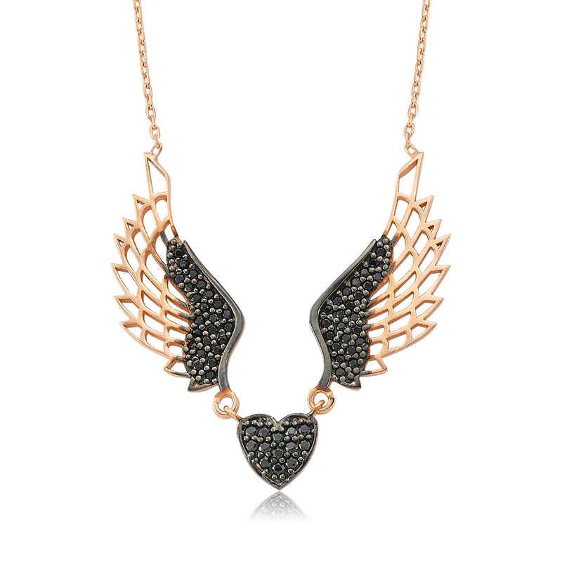 Sevdiğinizin kalbinin kanatlarınızın altında olduğunu anlatan siyah kanatlı melek kolye, duygularınızı ifade etmenizde yardımcı olacak en güzel aksesuarlardan biri olacaktır. Sevdiklerinizi sevindirebileceğiniz en anlamlı hediyelerden kanatlı melek bayan kolye 925 ayar gümüşten imal edilmiştir. Gümüş üzerine rose altın kaplama yapılmıştır. Rose altın kaplama yapılan gümüş bayan kolye modelleri parlaklığını uzun süre muhafaza eder ve oksitlenmesi gecikir. Kolye üzerinde bulunan siyah taşlar zirkondur. Gümüş olan zincir boyu ortalama 45 cm"dir. Gümüş siyah kanatlı melek bayan kolye el emeği ile üretilmiştir. Gümüş ve değerli taşlar nedeniyle belirtilen ortalama ürün ağırlığında ± %10 sapma olabilmektedir.