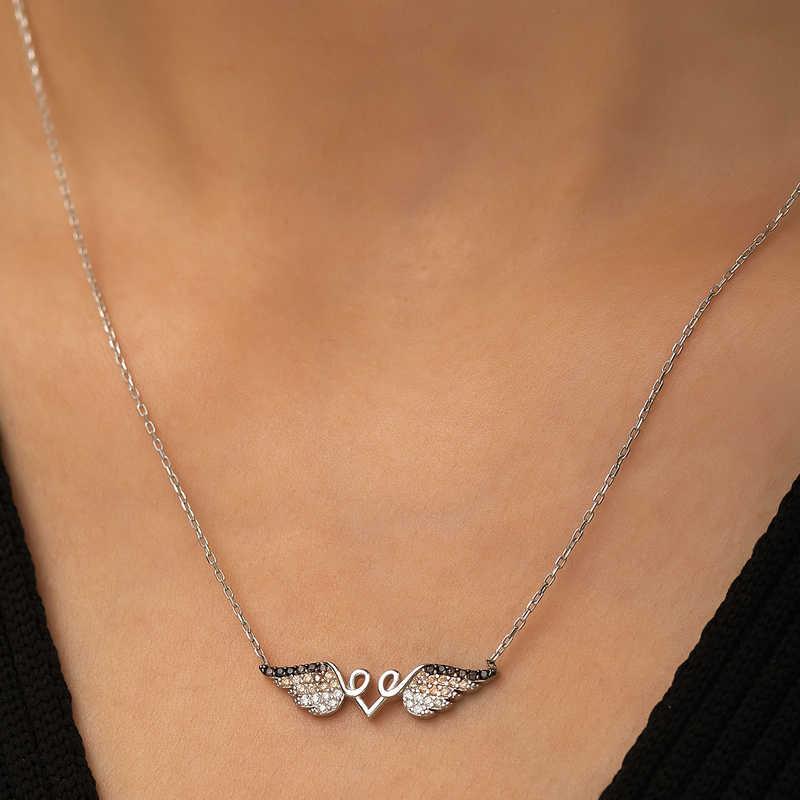 Melekler saflığın ve temizliğin simgeleridir. Bu nedenle melek kanatlı kalp kolye hediye edilen kişiye melek kadar saf ve temiz bir kalbinin olduğu mesajı verilmek istenmektedir. Bu özel melek kanatlı kalp kolye 925 ayar gümüşten imal edilmiştir. Gümüş üzerine rodyum kaplama yapılmıştır. Rodyum kaplama yapılan gümüş kolyeler parlaklığını uzun süre muhafaza eder ve oksitlenmesi gecikir. Tüm bayan gümüş kolyelerde olduğu gibi gümüş melek kanatlı kalp kolye de el emeği ile üretilmiştir. Gümüş ve değerli taşlar nedeniyle belirtilen ürün ağırlığında ± %10 sapma olabilmektedir.