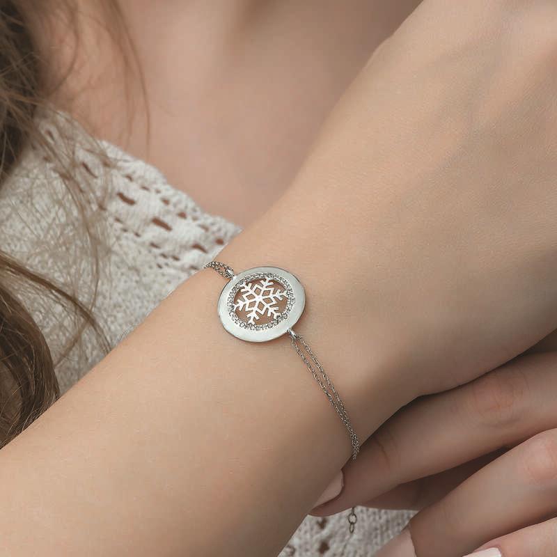 Kadınların ışıltısı, berraklığı kar tanesine benzetilmektedir. Kar taneleri sevdiğiniz kişiyi sembolize etmektedir. Kar tanelerinin her birinin bayanlar gibi eşsiz ve ayrı kıymette olması onları özel kılan bir diğer özelliktir. Kar tanesinin asilliği her dönemde dikkat çekmeyi başarmıştır. Bunun yanında insanların tıpkı kar taneleri gibi birbirlerine zarar vermeden de mutlu bir şekilde yaşayabileceklerini sembolize etmektedir. Bu şık ve anlamlı bileklik; doğum günü hediyesi, sevgililer günü hediyesi veya annelere hediye olarak özel günlerde tercih edilebilecek mükemmel bir seçenektir. Bileklik, 925 ayar gümüşten imal edilmiştir. Gümüş üzerine rodyum kaplama yapılmıştır. Rodyum kaplama yapılan ürünler parlaklığını uzun süre muhafaza eder ve ürünün oksitlenmesi gecikir. Tüm gümüş bayan bilekliklerde olduğu gibi bu gümüş kar tanesi bayan bileklik de tamamı el emeği ile üretilmiştir. Gümüş ve değerli taşlar nedeniyle belirtilen ortalama ürün ağırlığında ± %10 sapma olabilmektedir.