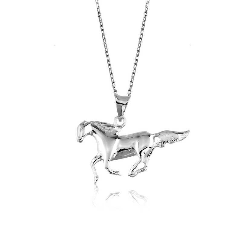 Türk kültüründe atların yeri son derecede önemlidir, atlar güç ve özgürlüğü simgeler. Özel tasarım koşan at kolye boynunuzdan çıkarmak istemeyeceğiniz kolyelerden biri olacaktır. 925 ayar gümüşten imal edilmiş bu özel tasarım kolyeyi sevdiğiniz ve değer verdiğiniz kişilere gücün ve özgürlüğün sembolü olarak hediye edebilirsiniz. Gümüş koşan at kolye üzerine oksit kaplama yapılmıştır. Oksit kaplama yapılan gümüş kolye modelleri parlaklığını uzun süre muhafaza eder. Tüm gümüş kolye modellerinde olduğu gibi gümüş koşan at kolye modeli de el emeği ile üretilmiştir. Gümüş ve değerli taşlar nedeniyle belirtilen ortalama ürün ağırlığında ± %10 sapma olabilmektedir.