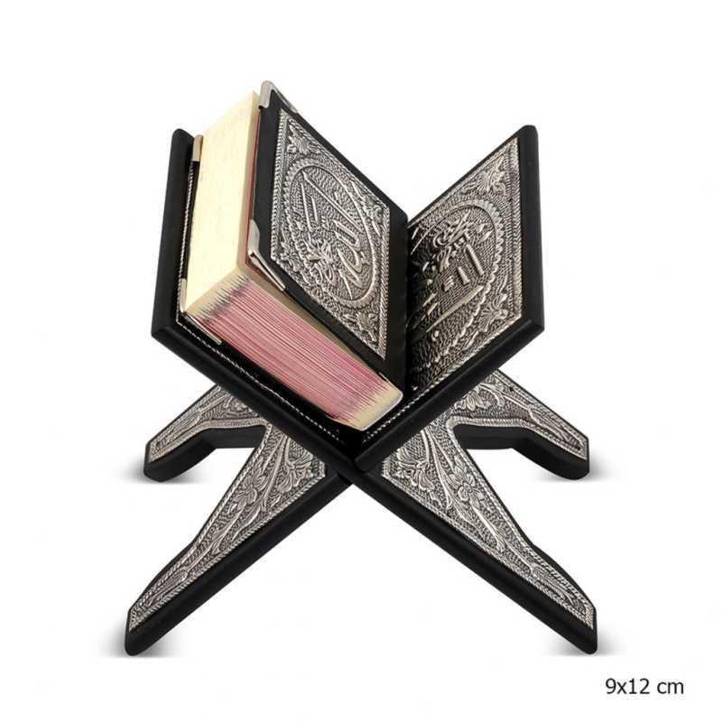 Usta ellerin maharetiyle şık bir görselliğe getirilmiş olan ahşap üzerine gümüş işlemeli rahlemiz sizlere en güzel görünüm ve tasarımla sunulmuştur. Ahşap Rahle ve Kuran-ı Kerim 925 ayar gümüş işlemedir. Ürünlerimizin tamamı el emeği ile üretilmiştir ve değerli taşlar nedeniyle ürün ağırlığında ± %10 sapma olabilmektedir.