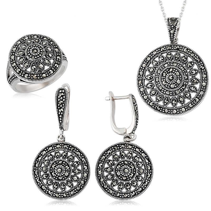 925 ayar gümüşten imal edilmiş olan bu özel tasarım gümüş markazit bayan set elmas tozlarından elde edilen markazit taşlarla süslenmiştir. Bir adet yüzük, bir adet kolye ucu ve bir çift küpeden oluşan bu gümüş markazit yuvarlak bayan set ile etrafınıza ışık saçmaya ne dersiniz? Sizin olduğu kadar sevdiklerinizin de keyifle takacağı bu markazit set hediye için de son derece uygundur. Hayatınızda değer verdiğiniz mutlu etmek istediğiniz sevdiklerinizi bu gümüş yuvarlak set ile sevindirebilirsiniz. Gümüş markazit bayan set üzerine oksit kaplama yapılmıştır. Oksit kaplama yapılmış gümüş markazit bayan set modelleri parlaklığını uzun süre muhafaza eder. Set ile birlikte 45 cm uzunluğunda gümüş zincir de gönderilecektir. Tüm gümüş bayan set modellerinde olduğu gibi gümüş markazit yuvarlak bayan set modelimiz de el emeği ile üretilmiştir. Gümüş ve değerli taşlar nedeniyle belirtilen ortalama ürün ağırlığında ± %10 sapma olabilmektedir.