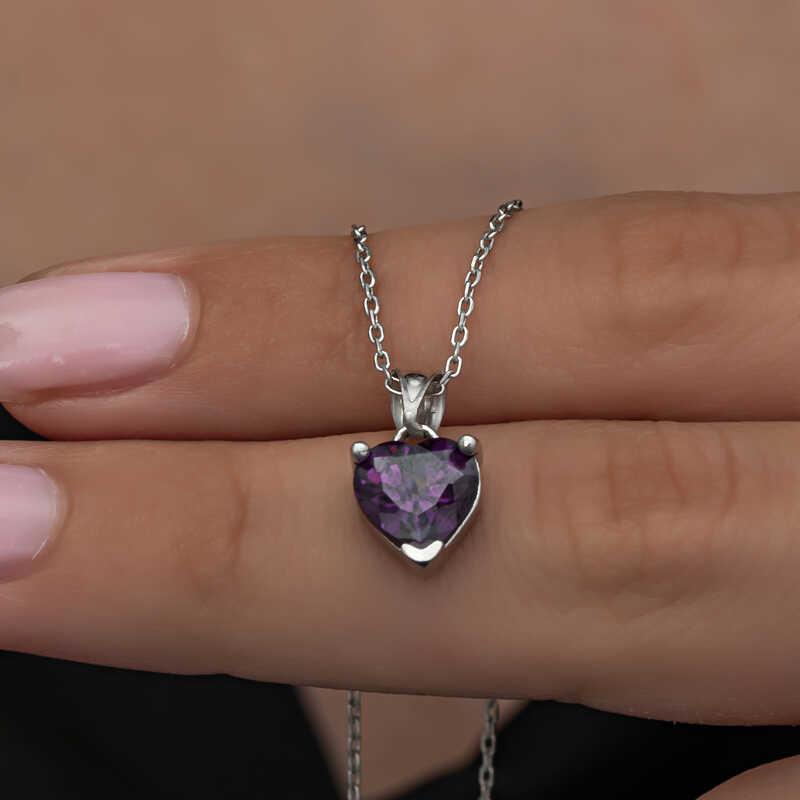 Gümüş Mor Taşlı Kalpli Kadın Kolye