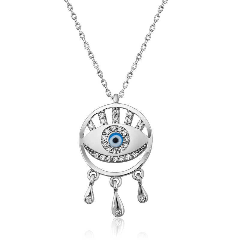 Birçok kültürde kötü enerjinin zararlarından korunmak için çeşitli tılsımlar kullanılmıştır. Doğu kültürlerinin çoğunda kullanılan tılsım ise gözdür. Nazar boncuğu da göz şeklinden ilham alınarak tasarlanmıştır. Mavi rengin seçilmesi de tesadüf değildir. Renkli gözlü kişilerin enerjisini daha etkili yansıttığı inancı gereği nazar boncukları çoğunlukla mavi olarak tasarlanır. Güzelliğiyle göz kamaştıran, nazardan korunmasını istediğiniz kişilere ve sevdiklerinize gümüş nazarlı göz kolyeyi armağan edebilirsiniz. Ürünlerimizin tamamı el emeği ile üretilmiştir. Gümüş ve değerli taşlar nedeniyle ürün ağırlığında ± %10 sapma olabilmektedir.