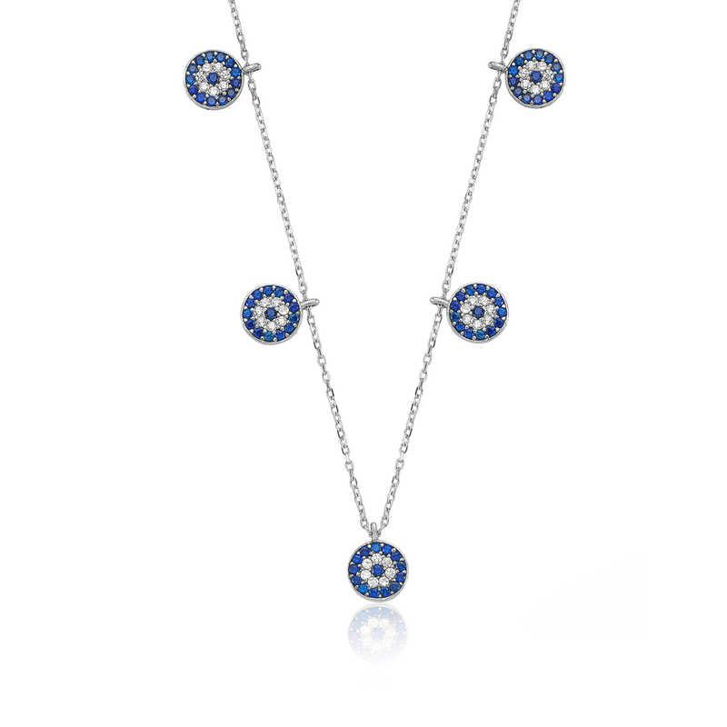 Gümüş nazar boncuğu sade tasarımıyla günlük hayatta rahatlıkla kullanabileceğiniz bir model. Nazar boncuğu sizi kem gözlerden alıkoyar. Bu şık gümüş kolye modeli üzerinde bulunan taşlar zirkondur. Gümüşün üzerine oksitlenmesi geciksin ve parlaklığını uzun süre muhafaza etsin diye rodyum kaplama yapılmıştır. Tamamen gümüş olan zincir uzunluğu ortalama 45 cm’dir. Bu nazarlı şans kolye modeli el emeği ile üretilmiştir. Gümüş ve değerli taşlar nedeniyle belirtilen ortalama ürün ağırlığında ± %10 sapma olabilmektedir.