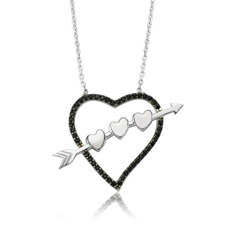 Kalbinizden vurulduğunuzu ve aşkla dolduğunuzu anlatan bu özel kalbe kalp oklarının saplandığı kolye sevdiğinize verebileceğiniz güzel bir hediye olacaktır. Sevgilinize doğum günü ve yıl dönümü günleri için romantik bir hediye arayışındaysanız, bayanların takmaktan çok hoşlanacağı kolye en anlamlı hediyelerden biri olacaktır. Oklu kalp bayan kolye 925 ayar gümüşten imal edilmiştir. Gümüş üzerine rodyum kaplama yapılmıştır. Rodyum kaplama yapılan gümüş bayan kolye modelleri parlaklığını uzun süre muhafaza eder ve oksitlenmesi gecikir. Kolye üzerinde bulunan taşlar zirkondur. Gümüş olan zincir boyu ortalama 45 cm"dir. Bu oklu kalp bayan kolye el emeği ile üretilmiştir. Gümüş ve değerli taşlar nedeniyle belirtilen ürün ağırlığında ± %10 sapma olabilmektedir.