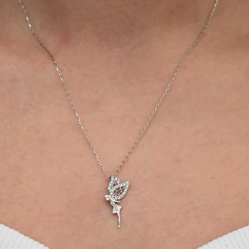 Hayal dünyasının sembolü olan peri kızı figürü ile tasarlanmış bu kolye, hem zarafeti hem de özgünlüğüyle her tarza uyum sağlar.Uçsuz bucaksız bir hayal dünyasının kapılarını aralamak için Peri kızı kadın kolyeyi sevdiklerinize hediye etmek için mükemmel bir seçenektir.Gümüş üzerine rodyum kaplama yapılmıştır.Rodyum kaplama yapılan kolyeler parlaklığını uzun süre muhafaza eder ve oksitlenmesi gecikir.Gümüş ve değerli taşlar nedeniyle belirtilen ortalama ürün ağırlığında ± %10 sapma olabilmektedir.