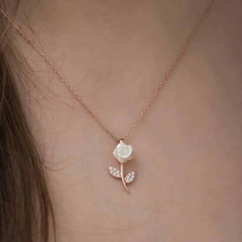 Beyaz güller tarih boyunca farklı kültürlerde görülmüş, dini veya siyasi semboller taşımıştır. Gül tarih boyunca şiirlere ve resimlere ilham kaynağı olmuştur. Bununla birlikte beyaz gül aşkın masumluğun sembolü olmuştur ve en çok bu yönüyle tanınır. Siz de sevginizi anlatabileceğiniz gümüş beyaz gül kolyeyi sevdiğinize armağan edebilir, ona olan sevginizi teninde hissettirebilirsiniz. Bu şık kolye; doğum günü hediyesi, sevgililer günü veya özel günlerde tercih edilebilecek mükemmel bir seçenektir. Kolye; 925 ayar gümüşten imal edilmiştir. Gümüş üzerine rose kaplama yapılmıştır. Rose kaplama yapılan ürünler gümüşe pembe bakır rengi verir. Diğer kolyelerde olduğu gibi gümüş beyaz gül kolye de el emeği ile üretilmiştir. Gümüş ve değerli taşlar nedeniyle belirtilen ortalama ürün ağırlığında ± %10 sapma olabilmektedir.