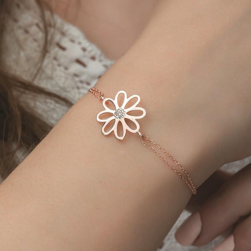 Sevdiklerinize duygularınızı ifade etmenin yolu neden çiçek desenli zarif bir bileklik olmasın? Özel zamanlarda O’na gönderebileceğiniz, hediye seçenekleri arasında yer alan bu şık bileklik sevdiklerinizi sevindirmenin en güzel yolları arasında yer almaktadır. En kaliteli, en ışıltılı taşlarla hazırlanmış gümüş çiçek bayan bileklik; sevgisini bir kez daha anlatmak isteyenleri, sen bir çiçeksin demek isteyenleri bekliyor. Bu özel tasarım gümüş çiçek bayan bileklik 925 ayar gümüşten imal edilmiştir. Gümüş üzerine rose altın kaplama yapılmıştır. Rose altın kaplama yapılan gümüş bayan bileklik modelleri parlaklığını uzun süre muhafaza eder ve oksitlenmesi gecikir. Tüm bayan gümüş bileklik modellerinde olduğu gibi gümüş rose çiçek bayan bileklik de el emeği ile üretilmiştir. Gümüş ve değerli taşlar nedeniyle belirtilen ürün ağırlığında ± %10 sapma olabilmektedir.