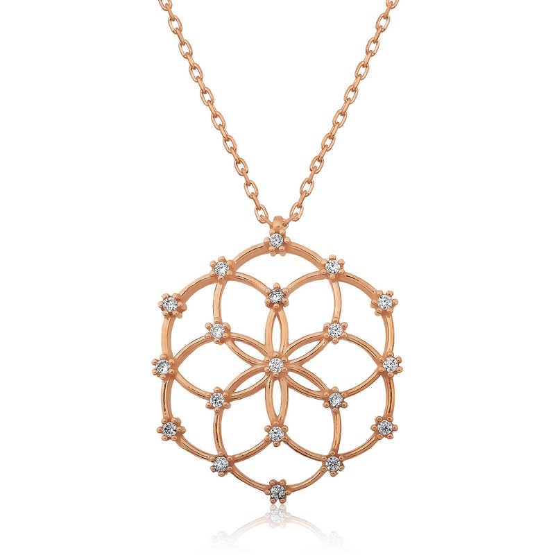 Yaşam çiçeği, iç içe geçmiş eşit alana sahip çok sayıda çember ve dışında büyük bir çemberden oluşan geometrik şekilden oluşmaktadır. Her bir çemberin merkezi, çevresindeki çemberin çevrelerinin kesiştiği yerdedir. Drunvalo Melchizedek bu sembolün evrenin ve yaşamın sırlarını barındırdığını iddia etmektedir. Günün her anında severek kullanabileceğiniz hoş bir aksesuardır. Gümüş yaşam çiçeği bayan kolye 925 ayar gümüşten imal edilmiştir. Bu kolye üzerine rose kaplama yapılmıştır.Rose kaplama yapılan ürünler parlaklığını uzun süre muhafaza eder ve gümüşü bakır rengine dönüştürür. Tüm gümüş bayan kolye modellerinde olduğu gibi gümüş yaşam çiçeği bayan kolye modeli de el emeği ile üretilmiştir. Gümüş ve değerli taşlar nedeniyle belirtilen ortalama ürün ağırlığında ± %10 sapma olabilmektedir. Ürünlerimizin tamamı el emeği ile üretilmiştir.