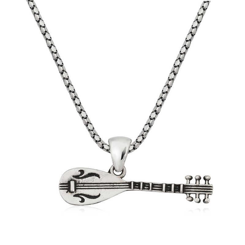 Bağlama ya da saz Türk Halk Müziğinde yaygın olarak kullanılan telli tezeneli bir çalgı türüdür. Enstrüman temalı kolyeler; müzikle uğraşan, müzik tutkunları için en çekici modeller arasında yer alıyor. Genellikle müzisyenlerin tercih ettiği ve gittikleri her yere müziğini götürdüğü gümüş kolyeler, günlük hayatta kişinin tarzını yansıttığı hoş bir aksesuardır. Sizin olduğu kadar sevdiklerinizin de keyifle takacağı bu gümüş saz kolye modeli en güzel hediyelerden biri olacaktır. Saz kolye 925 ayar gümüşten imal edilmiştir. Gümüş üzerine oksit kaplama yapılmıştır. Oksit kaplama yapılan gümüş kolye modelleri parlaklığını uzun süre muhafaza eder ve oksitlenmesi gecikir. Gümüş kolyenin ortalama boyu 50 cm\"dir. Tüm kolye modellerinde olduğu gibi gümüş saz kolye modeli de el emeği ile üretilmiştir. Gümüş ve değerli taşlar nedeniyle belirtilen ortalama ürün ağırlığında ± %10 sapma olabilmektedir.