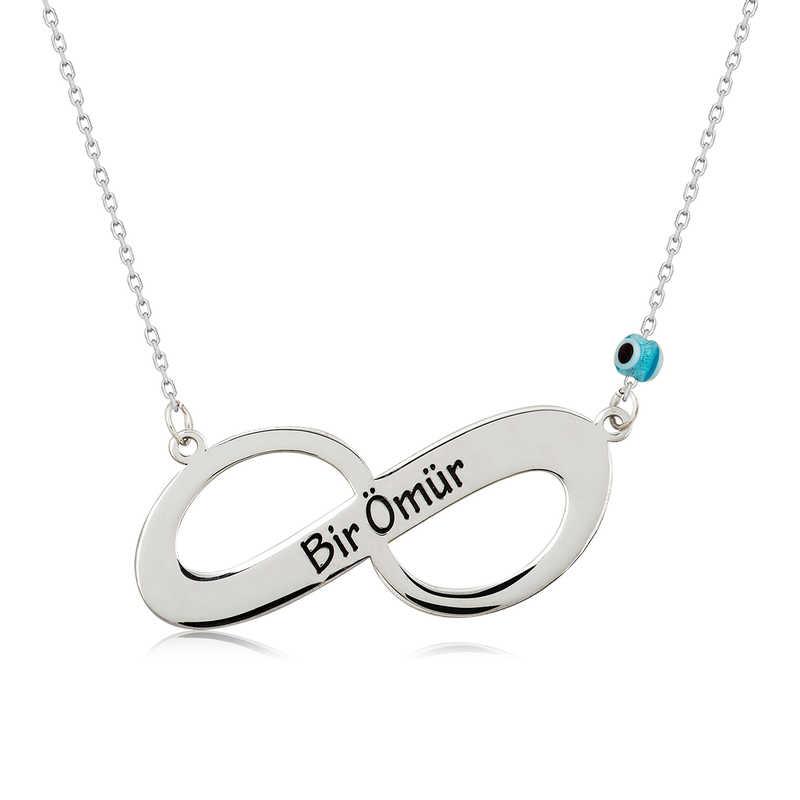 Sevgilinize sonsuz aşkı ifade etmenin en güzel, en anlamlı yollarından biri de ona sonsuzluk temalı gümüş takılar hediye etmektir. Sevgilinize hediye edeceğiniz bu özel kolye ile ona olan sonsuz aşkınızı sevginizi ifade edebilir sonsuza kadar birlikte olacağınız mesajı verebilirsiniz. Sonsuz bir ömür bayan kolye modeli 925 ayar gümüşten imal edilmiştir. Gümüş üzerine rodyum kaplama yapılmıştır. Rodyum kaplama yapılan gümüş bayan kolyeler parlaklığını uzun süre muhafaza eder ve oksitlenmesi gecikir. Gümüş olan zincirin boyu ortalama 45 cm\"dir. Kolye üzerinde bir ömür yazmaktadır. Tüm gümüş bayan kolye modellerinde olduğu gibi gümüş sonsuz bir ömür bayan kolye modeli de el emeği ile üretilmiştir. Gümüş ve değerli taşlar nedeniyle belirtilen ortalama ürün ağırlığında ± %10 sapma olabilmektedir.