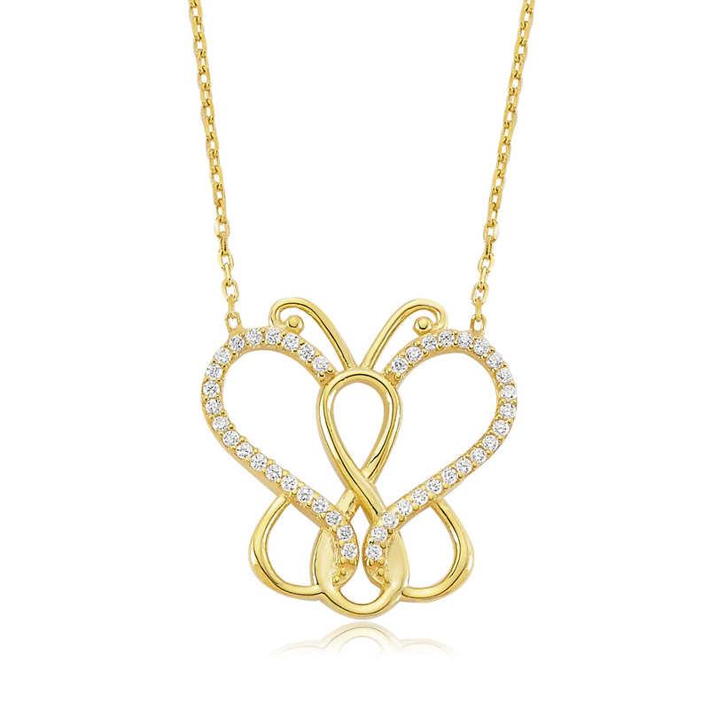 Kelebek kolye tertemiz sevginin ve aşkın ifadesidir. Sonsuz sevginizi sevdiğinize gösterebileceğiniz bir kolye modelidir. Sevdiklerinize alabileceğiniz anlamlı bir hediye bu şık kelebek bayan kolye 925 ayar gümüşten imal edilmiştir. Gümüş üzerine altın kaplama yapılmıştır. Altın kaplama yapılan gümüş bayan kolye modelleri parlaklığını uzun süre muhafaza eder ve oksitlenmesi gecikir. Kolye üzerinde bulunan beyaz taşlar zirkondur. Gümüş olan zincir boyu ortalama 45 cm"dir. Gümüş sonsuzluk kelebek bayan kolye modeli diğer tüm gümüş bayan kolye modellerinde olduğu gibi el emeği ile üretilmiştir. Gümüş ve değerli taşlar nedeniyle belirtilen ortalama ürün ağırlığında ± %10 sapma olabilmektedir.
