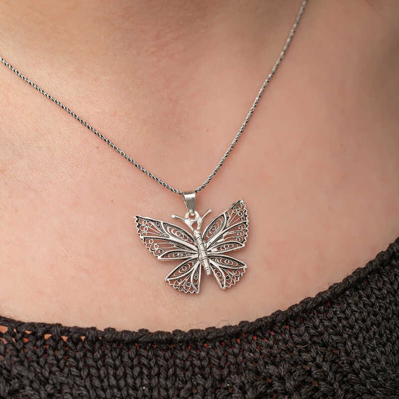 Özgürlüğü masumiyeti ve saflığı simgeleyen kelebekler, tertemiz sevginin ve aşkın ifadesidir. Bahar kelebekleri kolye anlam itibari ile aşkın küçük bir kıvılcım ile başladığı daha sonra büyük bir sabır ile büyüdüğü ve en sonunda ilan-ı aşkı ifade eder. Sizin olduğu kadar sevdiklerinizin de keyifle takacağı gümüş telkari kelebek kadın kolye en güzel hediyelerden biri olacaktır. Ürünlerimizin tamamı el emeği ile üretilmiştir. Gümüş ve değerli taşlar nedeniyle belirtilen ortalama ürün ağırlığında ± %10 sapma olabilmektedir.