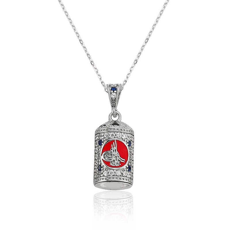 Osmanlı Devleti ve İmparatorluğu"ndaki padişahların imza olarak da kullandığı tuğra sembolü cevşen kolye ile birleşerek hem anlamı hem de dini boyutu ile güzel bir kolye haline gelmiştir. Böylelikle sevdiklerinizi veya kendinizi dini ve derin bir anlama sahip olan bu kolye ile sevindirebilirsiniz. Bu şık kolye modeli 925 ayar gümüşten imal edilmiştir. Gümüş üzerine rodyum kaplama yapılmıştır. Rodyum kaplama yapılan gümüş cevşenler parlaklığını uzun süre muhafaza eder, oksitlenmesi gecikir. Üzerinde bulunan taşlar zirkondur. Zincir boyu ortalama 45 cm"dir. Ürünlerimizin tamamı el emeği ile üretilmiştir. Gümüş ve değerli taşlar nedeniyle belirtilen ortalama ürün ağırlığında ± %10 sapma olabilmektedir.