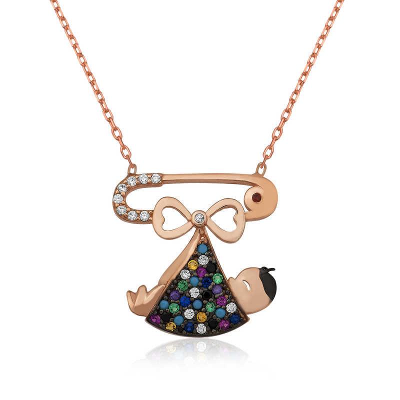 Anneye verilebilecek en anlamlı hediyelerden biride yeni doğan hediyesidir. Kundakta bebek figürünün yer aldığı kolye, anneye verilebilecek en güzel hediye seçeneklerinden biridir. Anneler günü başta olmak üzere bir anneye, anne adayına alınabilecek en güzel hediye seçenekleri arasında yer alan kolye modelleri eşsiz sevginizi anlatmanın en anlamlı yolu olacaktır. Anne adayları için tasarlanan bu kolye 925 ayar gümüşten imal edilmiştir. Gümüş Üzerine rose kaplama yapılmıştır. Rose kaplama yapılan gümüş yeni doğan bebek kolye modeli kaplaması sayesinde parlaklığını uzun süre muhafaza eder ve oksitlenmesi gecikir kolye üzerinde bulunan taşlar zirkondur gümüş olan zincir boyu ortalama 45 cm'dir. Gümüş yeni doğan bebek kolyesi el emeğiyle üretilmiştir. Gümüş ve değerli taşlar nedeniyle belirtilen ürün ağırlığında ±%10 sapma olabilmektedir.