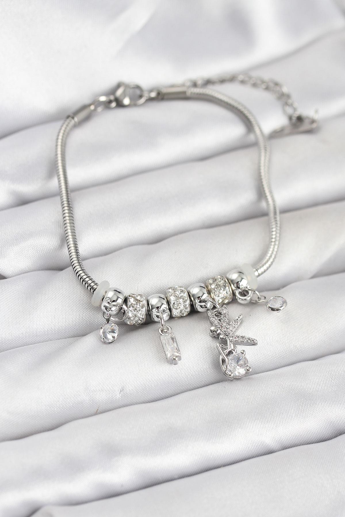 Pirinç Gümüş Renk Tinkerbell Charmlı Kadın Bileklik